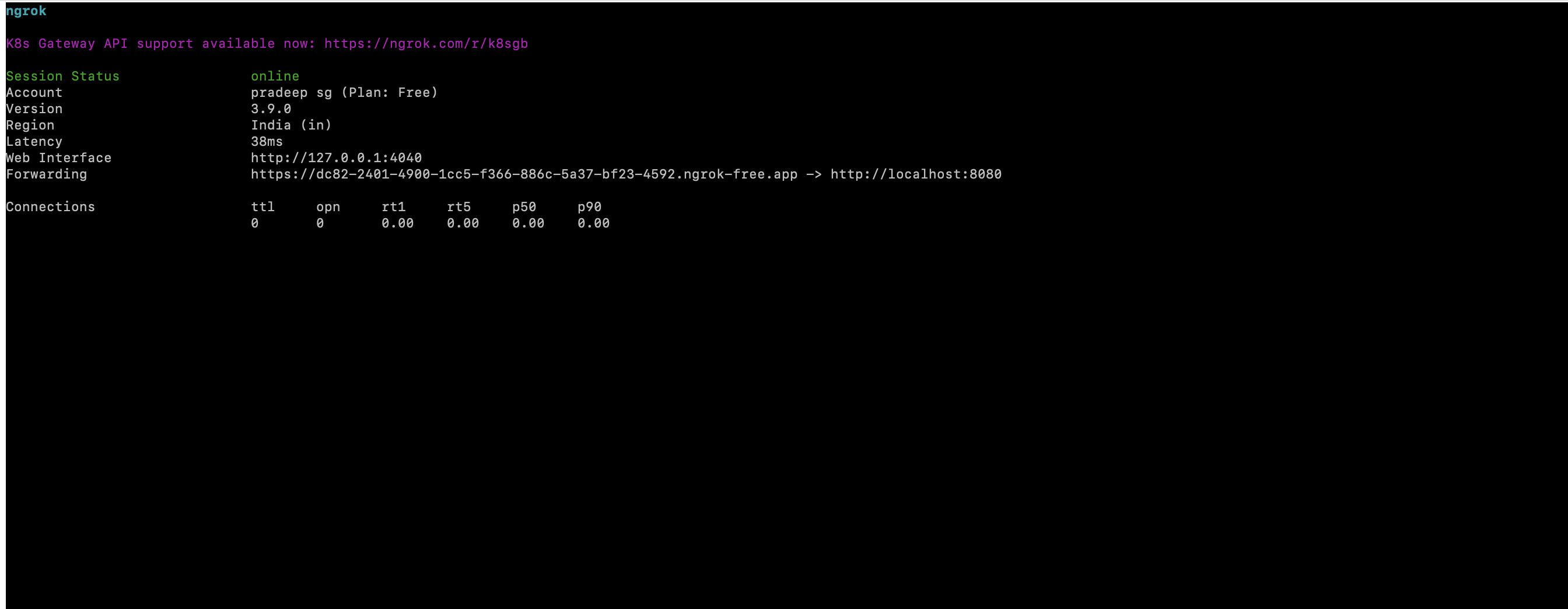 After running ngrok, you will see a forwarding URL in the terminal. Copy this URL as it will be used to connect Slack to your local application.