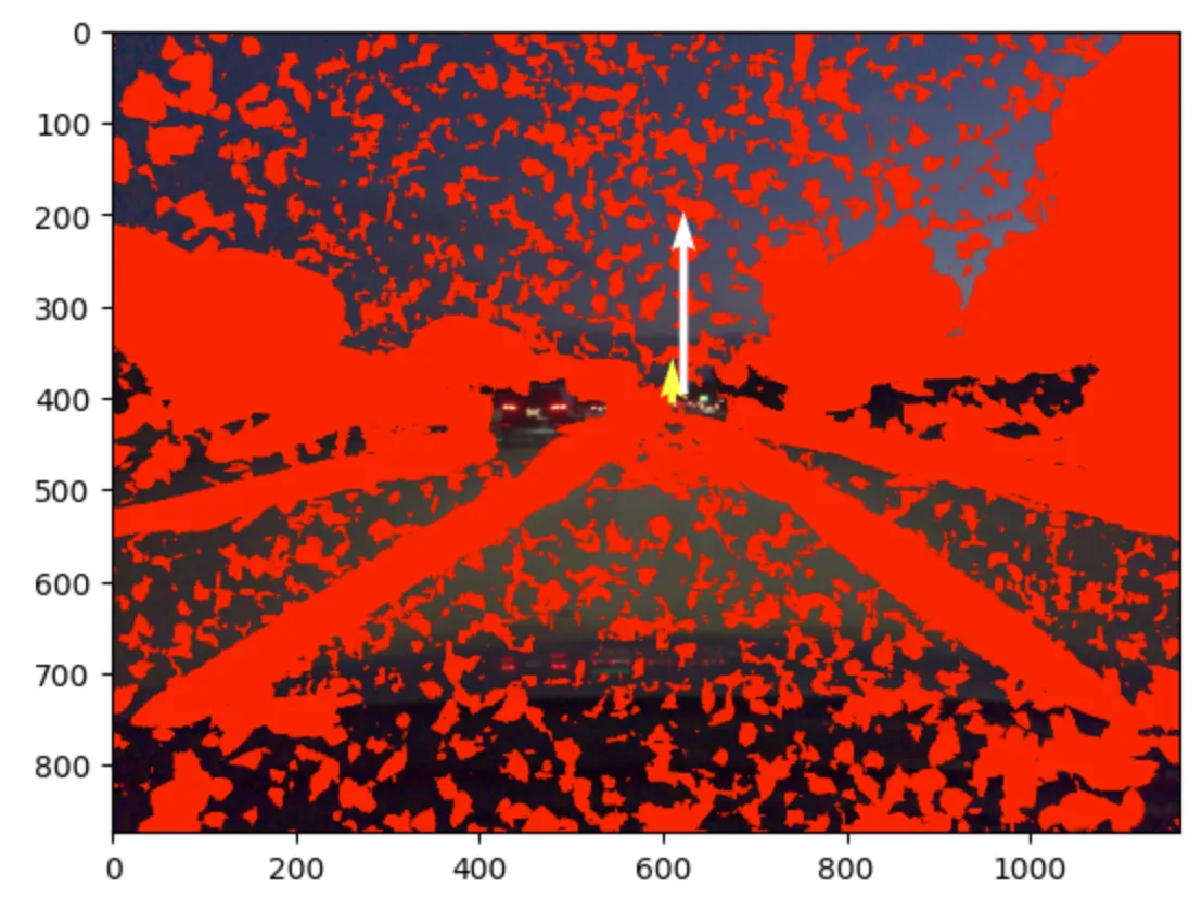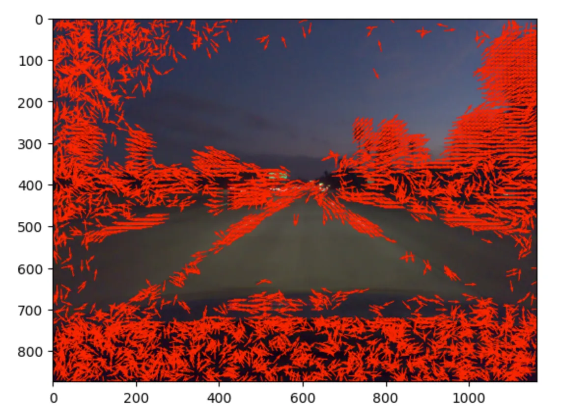 This picture is a visualization of an optical flow vector that has the largest magnitude from the video capturing that I’ve used to test an algorithm, and I think you should see enough optical flow vectors to calculate the point of car velocity.