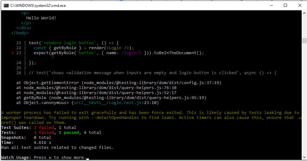 npm testif tests are not running already. Let's implement this feature in the component and pass the test case. Update the Login component code to add missing features as shown below.
