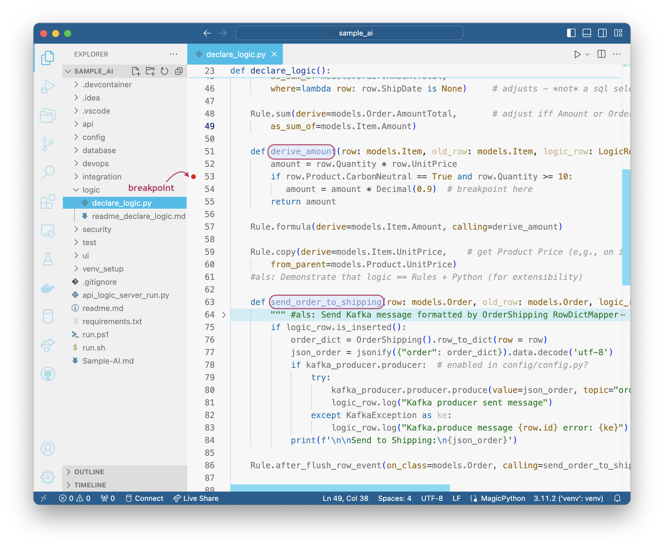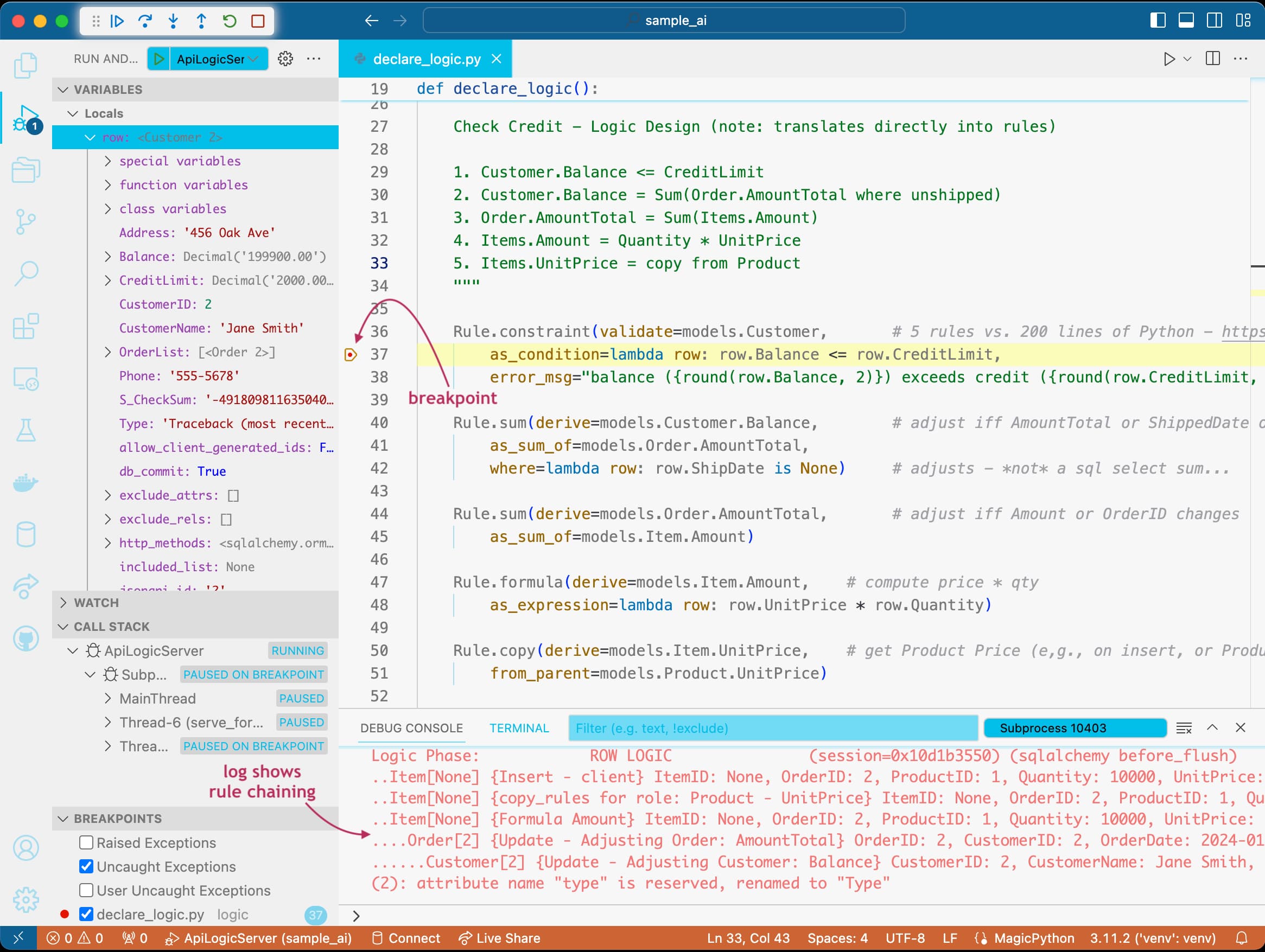 Logic Automation means that you can declare spreadsheet-like rules using Python. Such logic maintains database integrity with multi-table derivations, constraints, and security. Rules are 40X more concise than traditional code and can be extended with Python.
