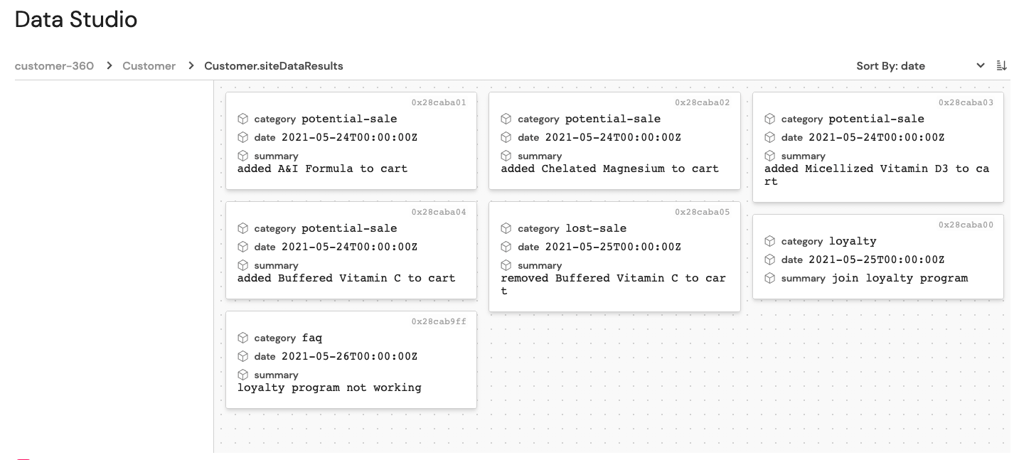 Upon inserting some sample data into the schema (which would normally arrive via Dgraph Cloud-driven integrations with external systems), the Data Studio view in Dgraph Cloud presents a high-level view of the customer: