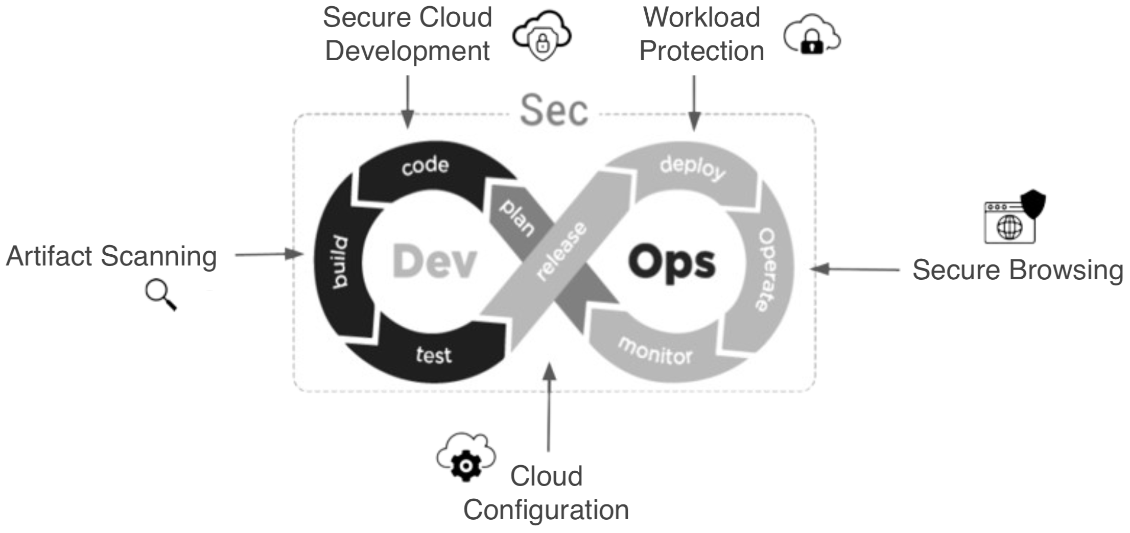 Figure 4. CNAPP model and DevOps SDLC augmented with secure cloud development and browsing