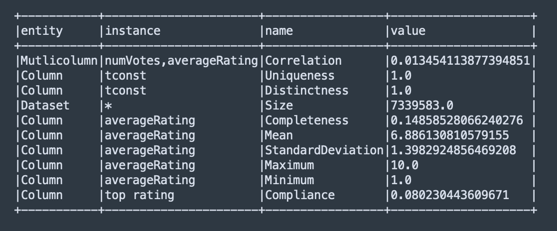 We'll use the following Scala script to profile the dataset. This script will apply various Deequ analyzers to compute metrics such as the size of the dataset, the completeness of the 'averageRating' column, and the uniqueness of the 'tconst' identifier.